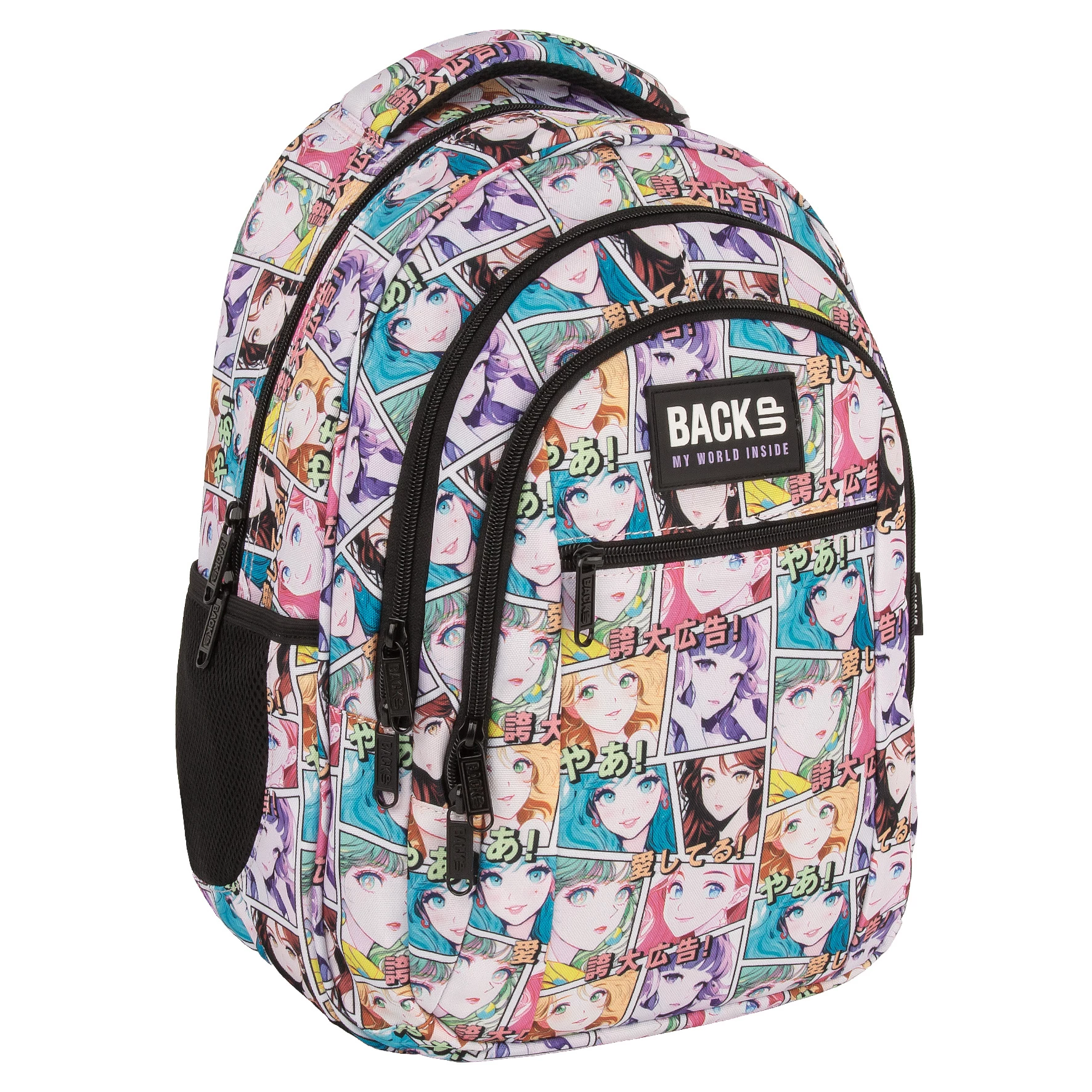 Personajele dinamice și decorațiunile colorate în stil benzi desenate fac ca acest rucsac să fie unic. Manga este o artă japoneză fascinantă și unică, formată din desene animate și benzi desenate. Personajele sunt reprezentate cu ochi mari, strălucitori și caracteristici, iar privirea lor inspiră imaginația pentru a inventa povești unice.