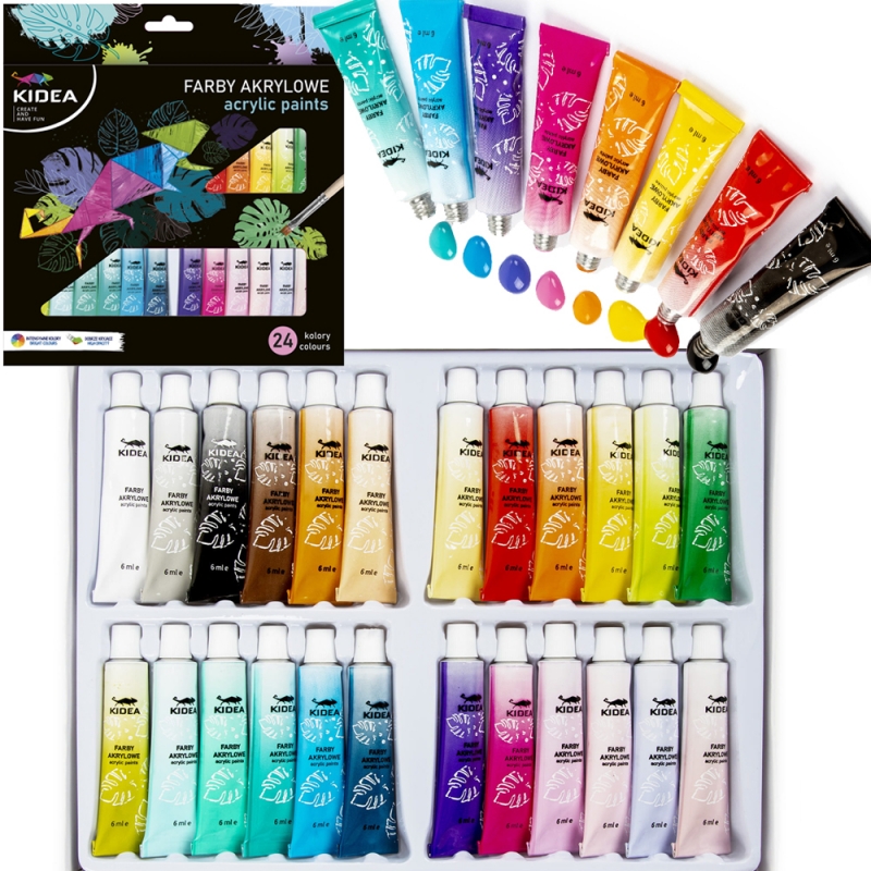 Etichete: lemn, pietre, ```, 24 culori, panza, Culori intense, Proiecte artistice, arta, set KIDEA, tuburi 6 ml, vopsea acrilica, Copii, hartie, sticla