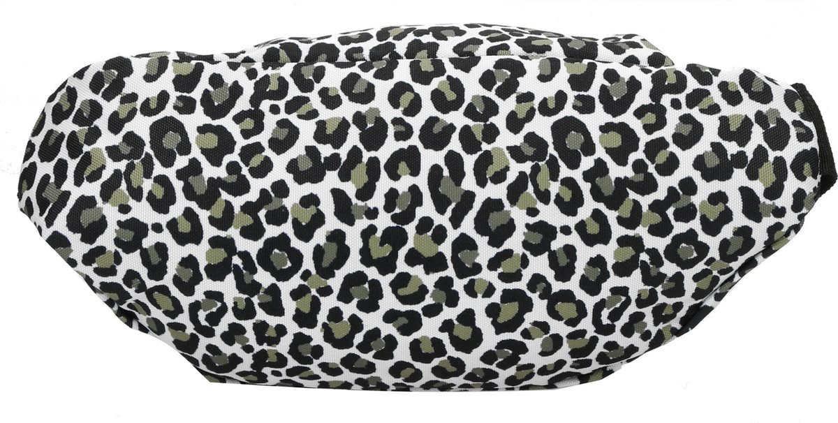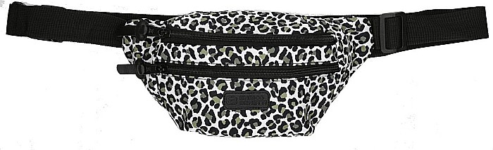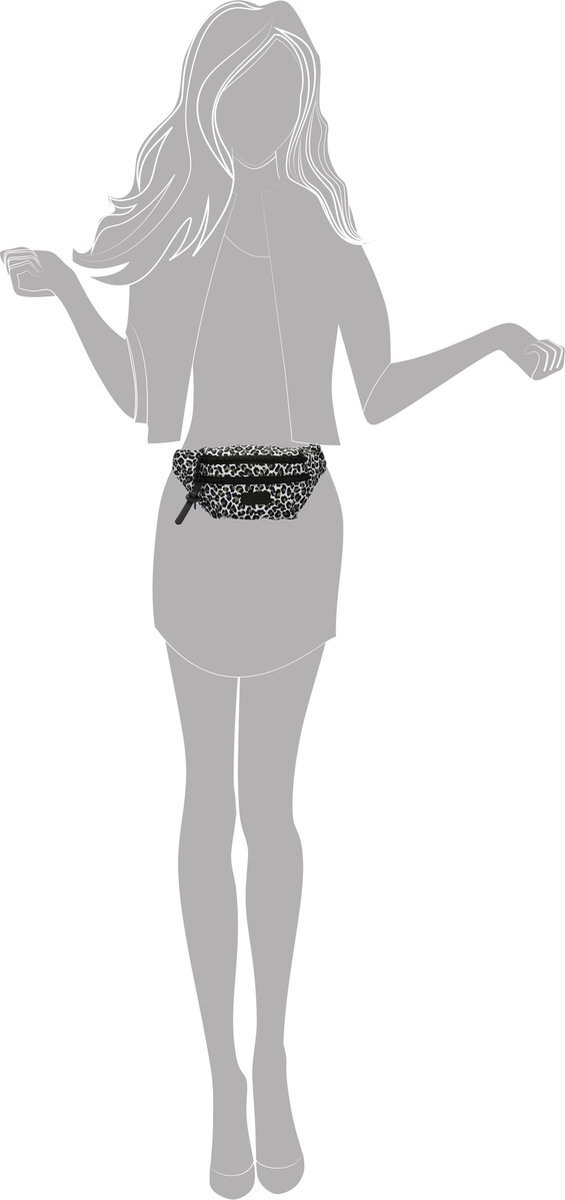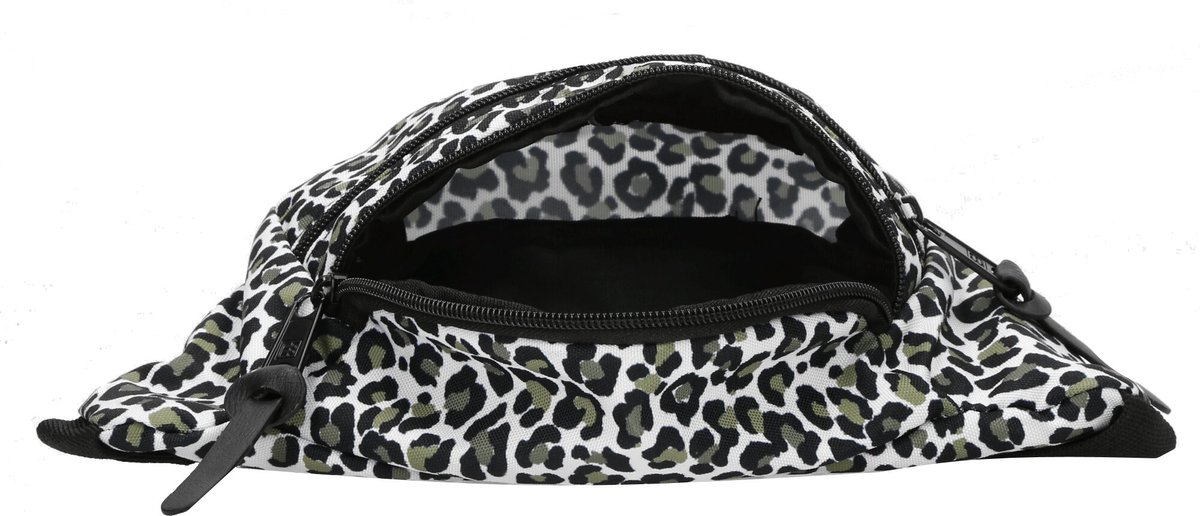 Geanta de talie are un buzunar frontal cu fermoar și un compartiment principal cu fermoar.