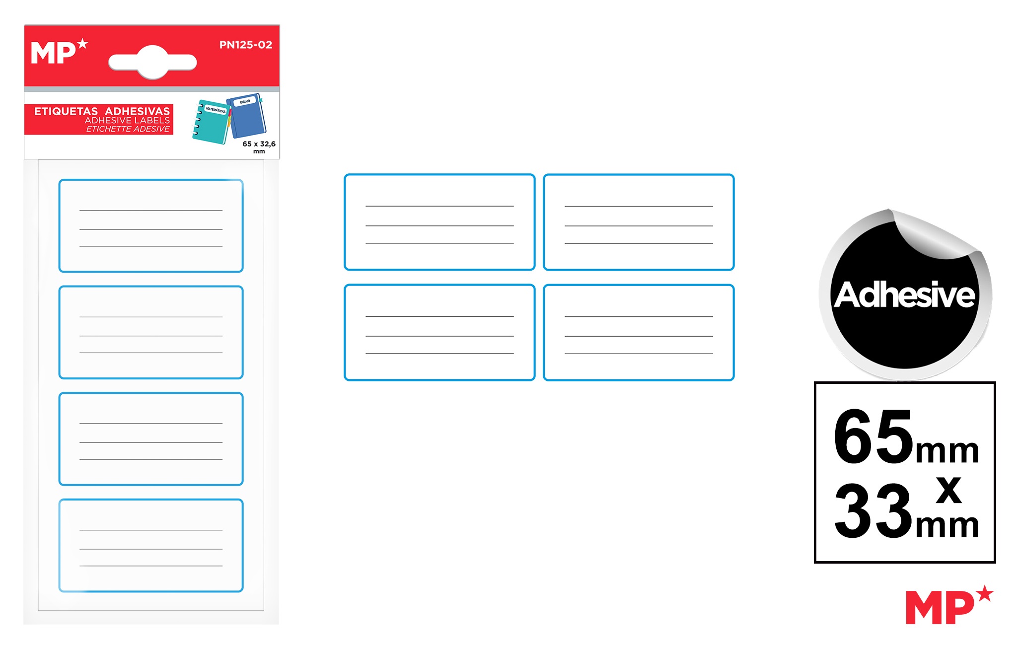 Adhesive labels to personalize objects, books,notebooks...with printed lines to write the name.Labelmeasurements: 32,6 x 65 mm. Colour: blue.