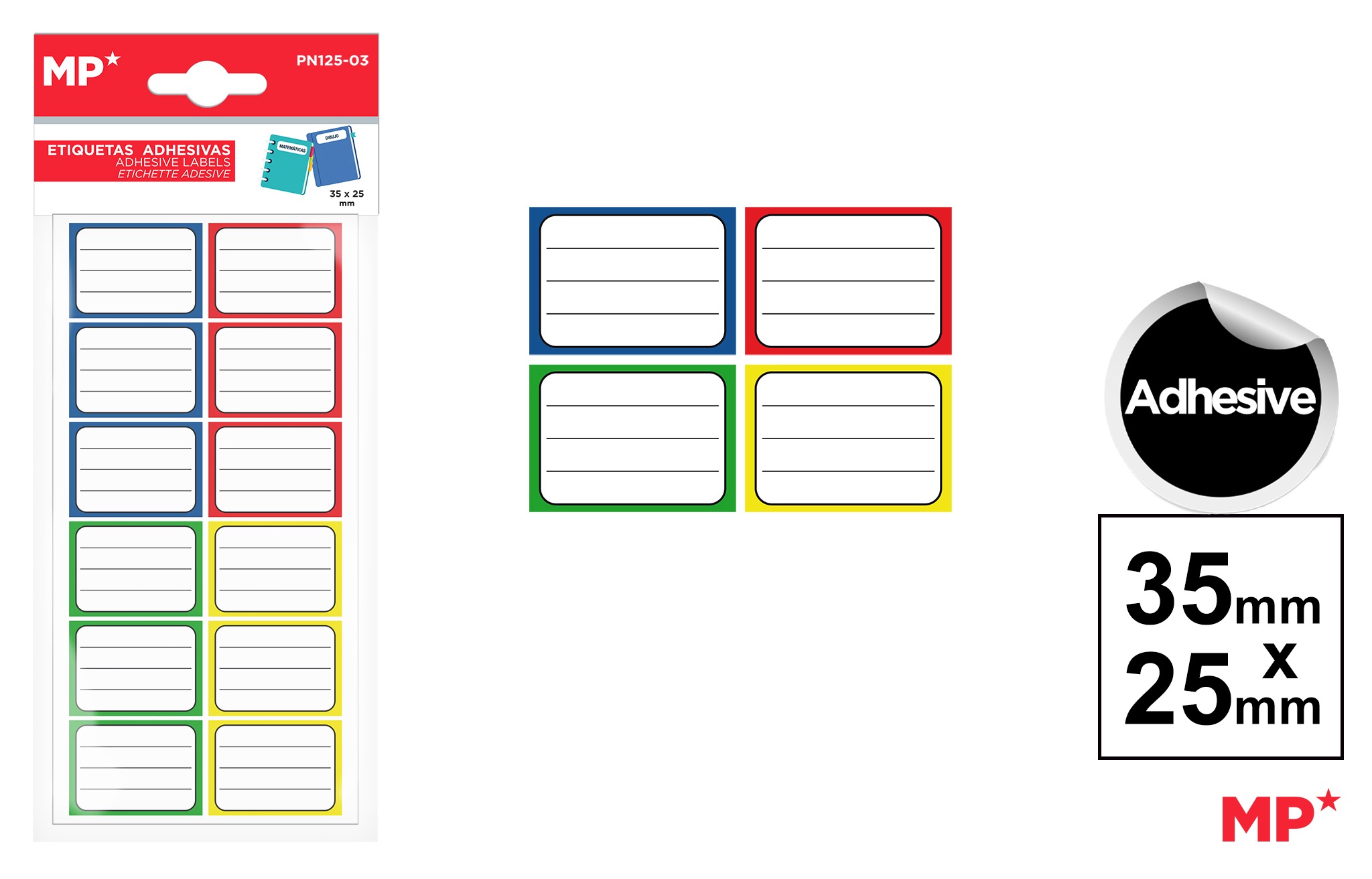 Adhesive labels to personalize objects, books,notebooks...with printed lines to write the name.Labelmeasurements: 25 x 35 mm. Assorted colours.