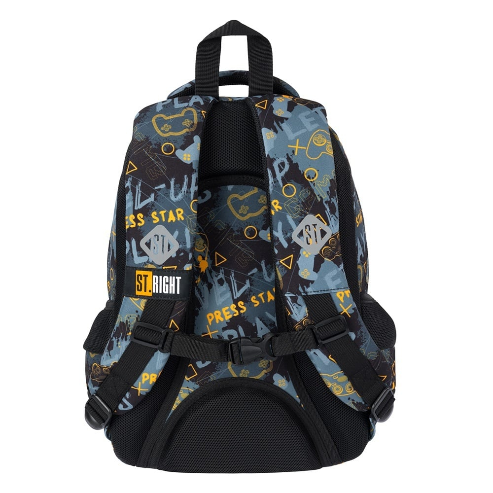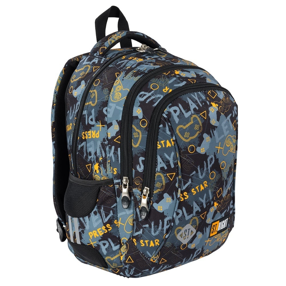 3 compartimente 2 buzunare exterioare 1 buzunar interior suplimentar inchis cu fermoar organizator cu inel cheie Confort si siguranta: spate ergonomic profilat, rigidizat bretele moi cu lungime reglabila material impermeabil maner intarit, ergonomic cheitele de la fermoarul compartimentului principal permit utilizarea unui lacat sau a unei criptari TSA elemente reflectorizante baza ghiozdanului este rigidizata cu burete dimensiuni: inaltime 39 cm latime 27 cm adancime de 17 cm Greutate: 650 g Capacitate: 20 l Ghiozdan pentru clasele 0-2, 3 compartimente, Majewski, Gama St. Right, un ghiozdan modern si confortabil, de foarte buna calitate, finisat si decorat cu tehnologii avansate. Ghiozdanul este confectionat din materiale impermeabile, rezistente la uzura si inghet. Ghiozdanul este deosebit de incapator, cu o compartimentare excelenta, avand spatii pentru carti, caiete, accesorii si rechizite, asigurand astfel o foarte buna organizare. Prevazut cu un compartiment principal ce se inchide cu doua fermoare si doua compartimente frontale ce se inchid cu fermoar, ghiozdanul este deosebit de spatios si practic. Compartimentul principal al ghiozdanului este dotat cu un buzunar special pentru a pastra diverse articole de mici dimensiuni. Unul din compartimentele frontale ale ghiozdanului este dotat cu mai multe separatoare interioare (destinate articolelor precum chei, bani, memory-stick-uri, accesorii telefon, instrumente de scris sau alte obiecte importante de mici dimensiuni), precum si cu un breloc detasabil pentru cheie. Ghiozdanul este prevazut cu doua buzunare laterale cu elastic, ideale pentru a pastra recipientul cu apa. Ghiozdanul este dotat cu elemente reflectorizante pe partea din fata, pe laterale si pe bretele. Elementele de design sunt acoperite cu material reflectorizant. Ghiozdanul este prevazut cu un maner buretat pentru a putea fi purtat si in mana. Spatele si bretelele sunt intarite si buretate cu un burete gros, oferindu-le fermitate si avand rolul de a proteja umerii si spatele. Spatele ghiozdanului este buretat ergonomic, dotat cu o zona de contact cu plasa, pentru o buna circulatie a aerului. Bretelele ghiozdanului sunt ajustabile, pentru ca acesta sa poata fi aranjat perfect pe spate. Fermoarele au zona de prindere cauciucata si profilata, pentru prindere usoara. Cheitele fermoarului compartimentului principal permit utilizarea unui lacat sau a unei criptari TSA. Baza ghiozdanului are zone de contact cauciucate pentru protejare la umezeala.