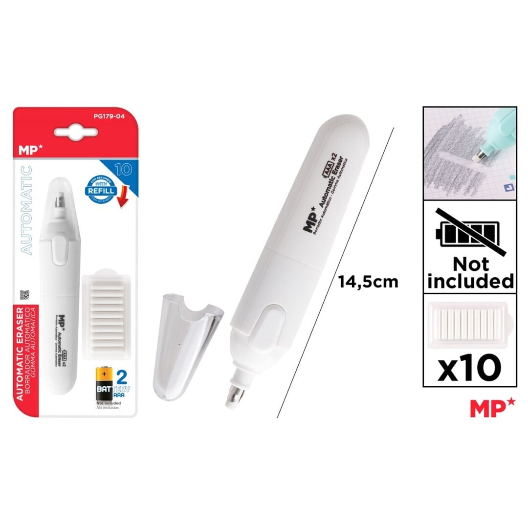Setul include 10 rezerve albe de gumă, asigurându-vă că veți avea suficient material pentru a continua utilizarea radierii. Această gumă este non-toxică, oferind o opțiune sigură pentru orice utilizator. Funcționează cu 2 baterii AAA (nu sunt incluse), oferindu-vă o portabilitate și durabilitate sporită.