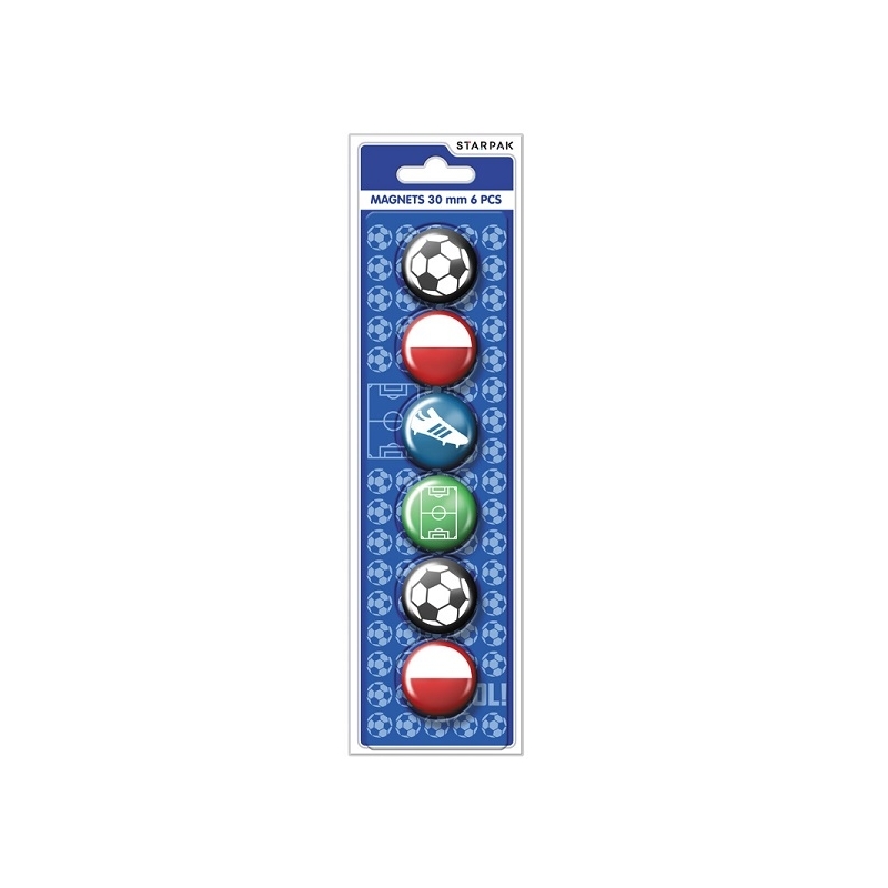 - Set de magneți puternici, cu motiv fotbal; - Magnetii sunt ambalați 6 bucati/blister; - Fabricati din plastic si metal; - Diametru: 30 mm. Dimensiune: 6,4x1,3x23 cm Greutate: 0,045 kg