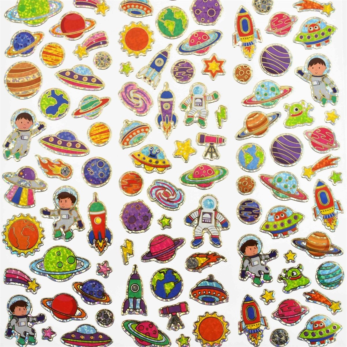 Stickerele Space de 34,5 cm sunt perfecte pentru cei pasionați de spațiu și explorare cosmică. Acestea adaugă o notă futuristă și interesantă oricărui proiect creativ, fiind ideale pentru decorarea caietelor, invitațiilor sau accesoriilor preferate de micii exploratori spațiali.