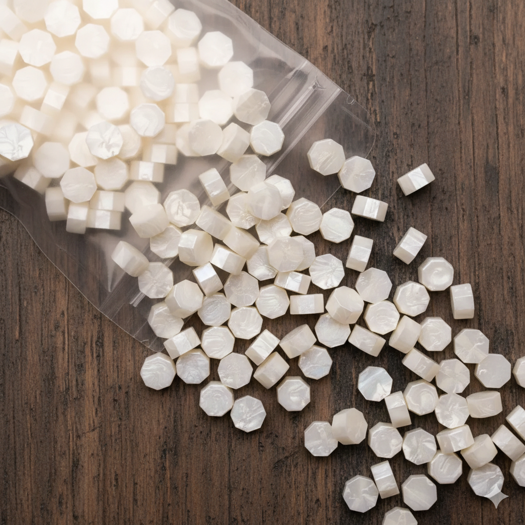 📦 GRANULE CEARĂ PENTRU SIGILII – ALB SIDEFAT, SET 100 BUCĂȚI ⭐