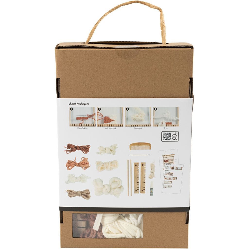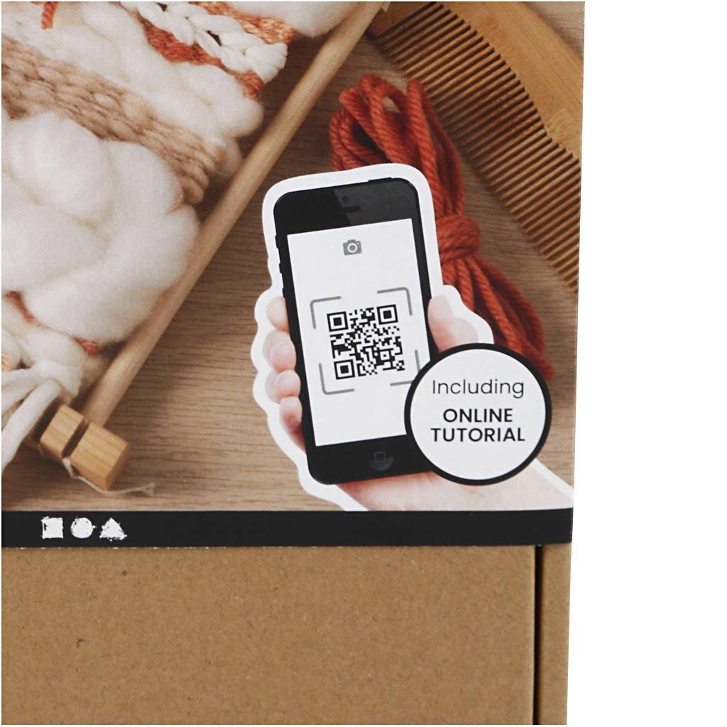 Learn how to weave with this training kit, which contains everything you need to get you started. Scan the QR code and be guided safely through the training, where you can learn different weaving techniques along with the basic elements of weaving. What's more, you'll have a finished woven hanging mobile at the end. The kit teaches you how to start/thread the loom, learn four different weaving techniques and how to finish the piece. The detailed video guides you through the activity and the techniques, which ends with an attractive woven wall hanging. The finished work can be used as a hanging decoration – you can either use the wooden loom as a frame or mount on a plate with a frame or on a stick, for example. Immersion. Experience a guiding hand to direct you through the training. Confidence in knowing that all materials are included in the kit and that you will be guided through the techniques. You gain a basic knowledge of the activity, giving you the confidence to start exploring more complex techniques on your own. The kit is aimed at young people and adults who are looking for an introduction to the craft and techniques, but who may not have got started yet, perhaps after finding it difficult to get a handle on the choice of materials and techniques. Contents: Loom (unassembled), glue, 6 m of warp thread, comb, yarn needle and yarn in different colours and qualities – 30 m of yarn in total. More Information SKU 42301 Unit set Ean nummer 5712854448338 Retail quantity 1 set Content quantity 1 set