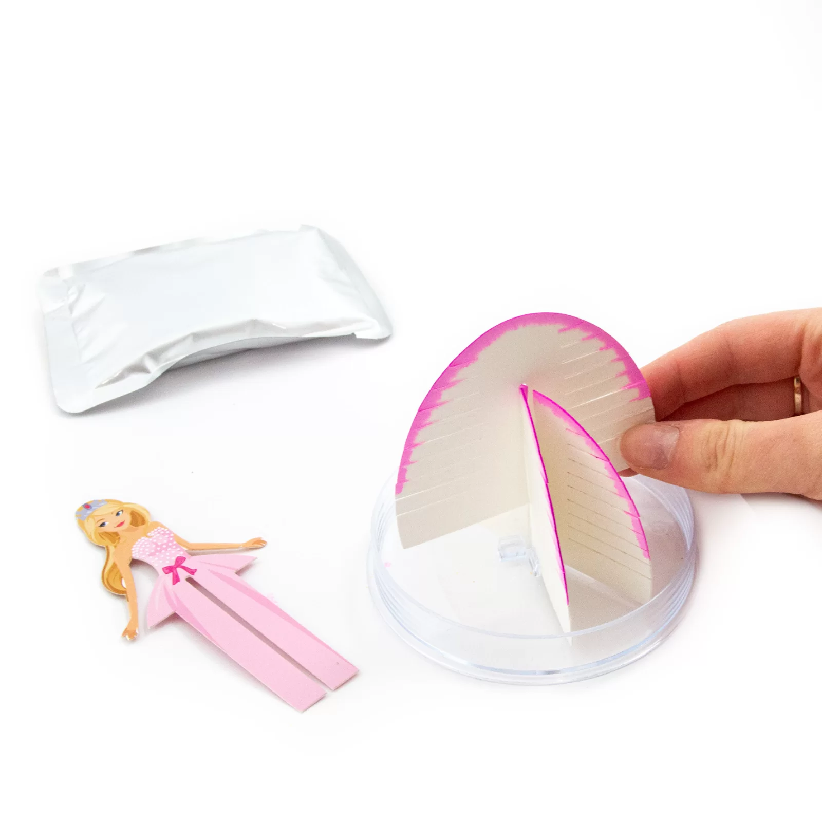 ✨ Include piese din carton pentru asamblare, suport și pungi speciale cu apă. După montare, trebuie doar să turnați apa inclusă peste rochița prințesei pentru a porni procesul magic de înflorire. În doar o oră, rochița va fi acoperită cu cristale colorate, creând un efect spectaculos și captivant.