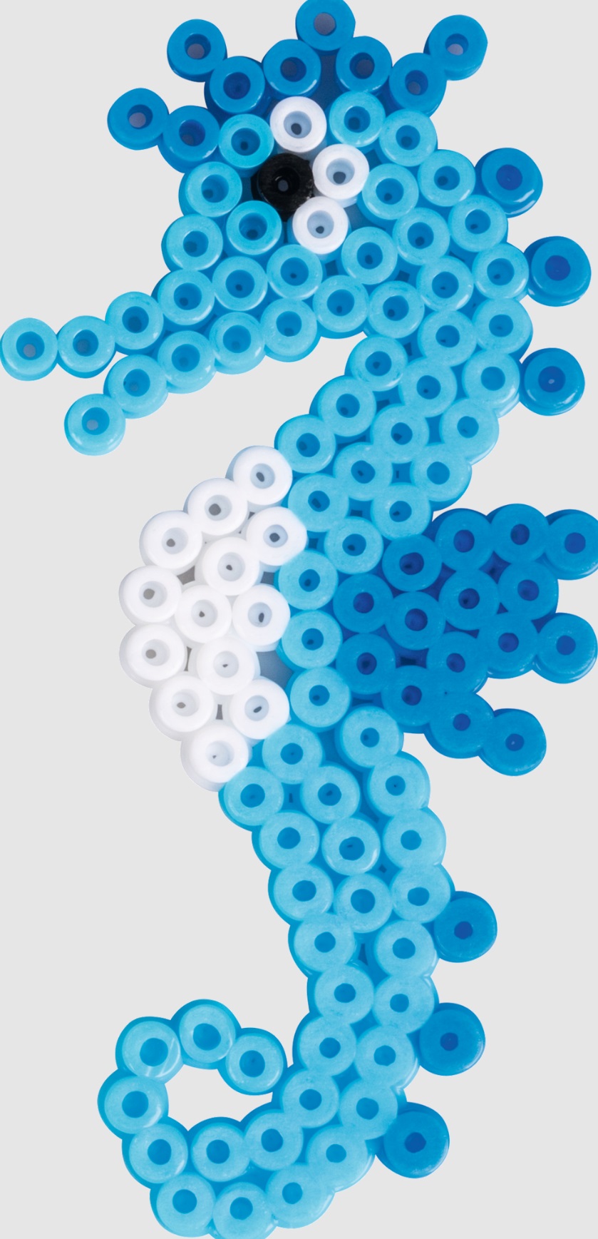 Etichete: cutie de carton, Material: Plastic, sablon, Dezvoltare motorie, Activitate distractivă, Dimensiuni: 150 × 220 × 20 mm, Conținut: margele termoadezive, placă de lucru, pinzetă, hârtie de călcat, Răbdare, Fereastră clară, Euro slot, Concentrație, Căluți de mare din margele termoadezive, set creativ