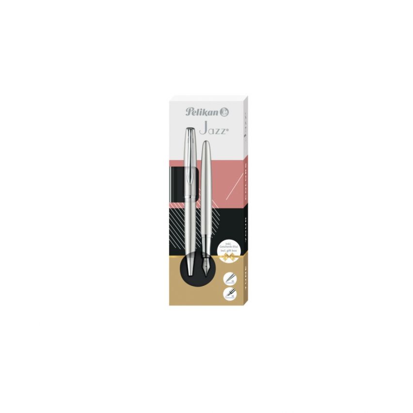 Pix Jazz Noble Elegance K/P36 Silver Box Pelikan stilou Jazz® Noble Elegance Silver Acest set de instrumente de scris Pelikan combină nobilul stil Jazz Noble Elegance și pixul. Această serie se caracterizează prin liniile sale curbate, care fac stiloul ușor și plin de viață. Butoiul superior și inferior lăcuit perlat se armonizează perfect cu vârful, inelul și clema colorate ton în ton. Clema tipică în formă de cioc Pelikan este încărcată cu arc și, prin urmare, deosebit de robustă. Alimentarea lină cu cerneală este asigurată de mecanismul convenabil de umplere a cartuşelor care face ca stiloul Jazz să fie uşor de utilizat. Penita din oțel inoxidabil lustruit de dimensiunea M este potrivită pentru scrieri de mână cu leagăne mai mari. Pixul cu mecanism de răsucire este echipat cu o reîncărcare king-size și include o cerneală de culoare albastră și în conformitate cu ISO 12757-2. Butoiul superior și inferior lăcuit USP Pearl; Clip, inel și prindere colorate; Clemă robustă datorită instalării cu arc; Pix cu sistem de umplere cu cartuş; Echipat cu încărcătură king-size înlocuibilă; Culoare cerneală albastru regal; Pix metalic cu mecanism de rotire; Echipat cu încărcătură king-size înlocuibilă; De culoare albastră și în conformitate cu cerneala pentru documente ISO 12757-2 USP Pearl lacquered upper and lower barrel; Colored clip, ring and grip; Robust clip due to spring mounted installation; Fountain pen with cartridge filling system; Equipped with replaceable king-size refill; Ink color royal blue; Metal ball pen with twist mechanism; Equipped with replaceable king-size refill; Blue colored and in accordance with ISO 12757-2 document-proof ink