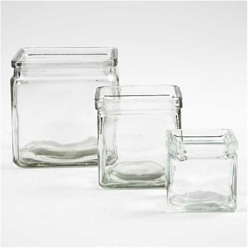Suport lumanari din sticla transparenta patrat, cu tortita din metal.