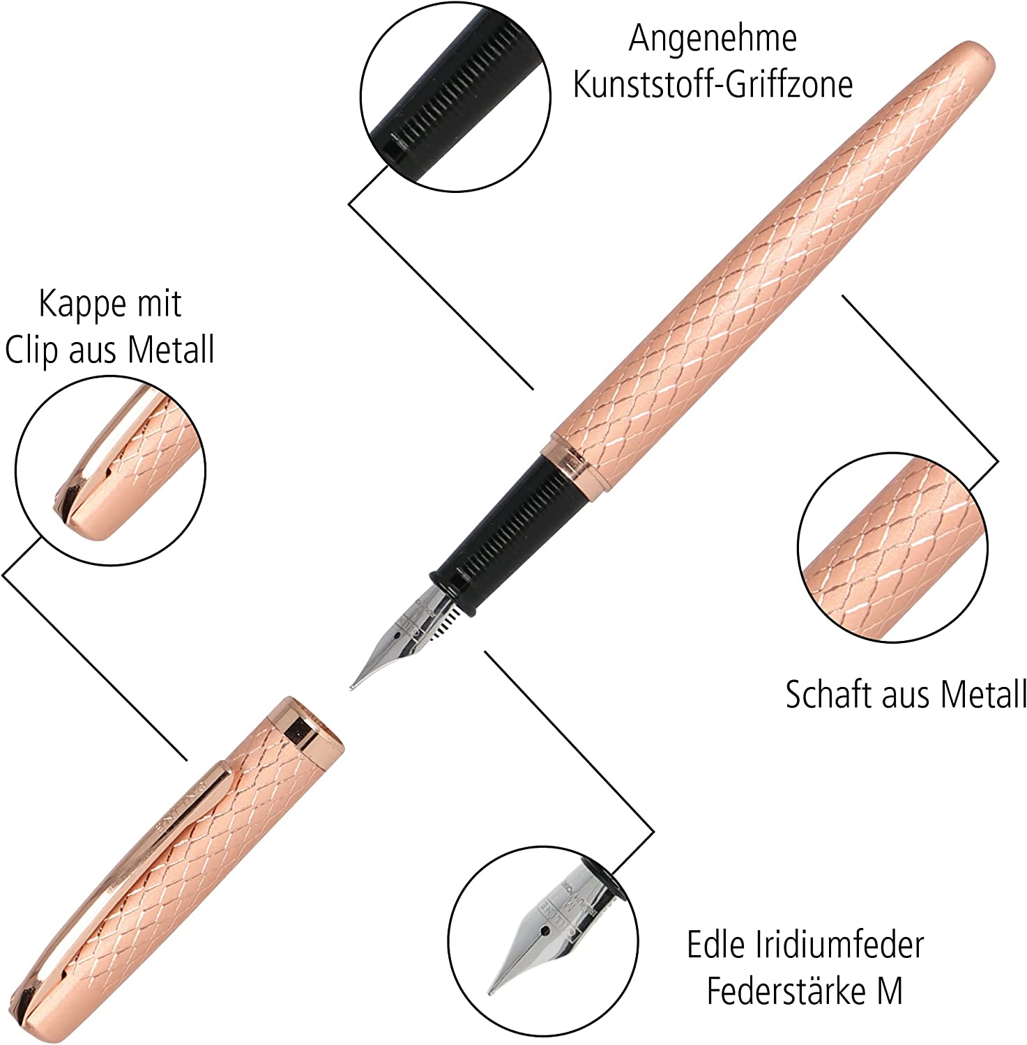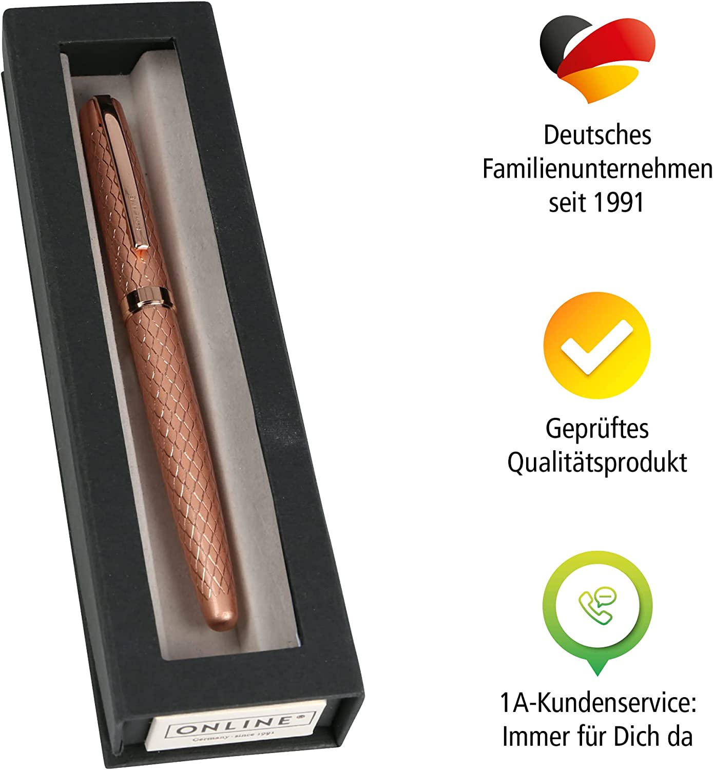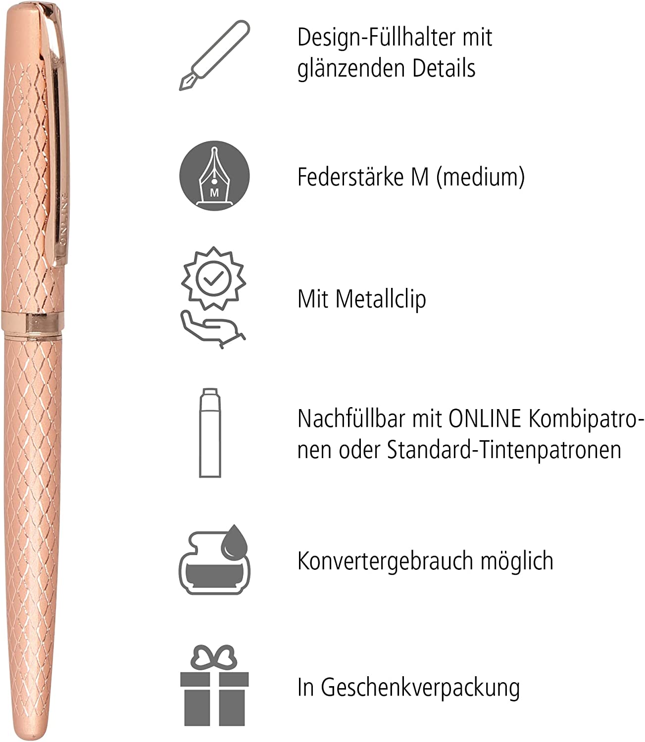 This ONLINE design metal fountain pen is equipped with a high-quality M nib (medium) and offers the highest level of writing. Delivered in a gift box, every writing instrument is an elegant gift. For standard cartridges, converter use is possible. Dimensions (LxWxH): 139 x 16 x 12 mm Weight: 19 g Colour: rosegold Design: Classic Line width: 0.5 mm Writing Colour: black Writing Position: Right handed