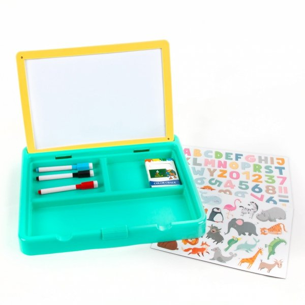 🖍️ Include 4 creioane colorate, 3 markere pentru scris uscat și o burete pentru ștergere, permițând jocuri și învățare atât pe tabla albă, cât și pe cea neagră.
