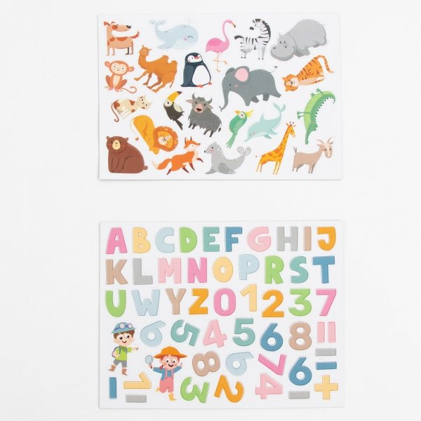 🎒 Carcasă compactă de 39 x 32,5 x 4,5 cm conținând 73 de magneți cu tematici de animale, litere și cifre, care pot fi așezați pe tabla magnetică.