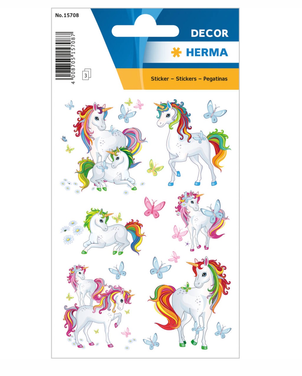Ref. no. 15708 Design Unicorn Version self-adhesive Material Paper Adhesive characteristics permanent Colour multicoloured Design category Children|Animals Content 3 sheets / 51 sticke EAN 4008705157087 Beautifully drawn unicorn stickers, perfect for collecting, swapping and decorating! Unicorns are very popular with girls and boys, the mythical creatures inspire and invite to dream. The unicorns are designed with white fur and colourful manes and tails, plus delicate butterflies and flowers. Each pack contains 3 sheets of stickers with 17 stickers each. The stickers are made of high-quality paper, are permanently adhesive and self-adhesive on almost all surfaces. They can be easily peeled off and stuck on as desired. Ideal as decoration for exercise books, files and folders,